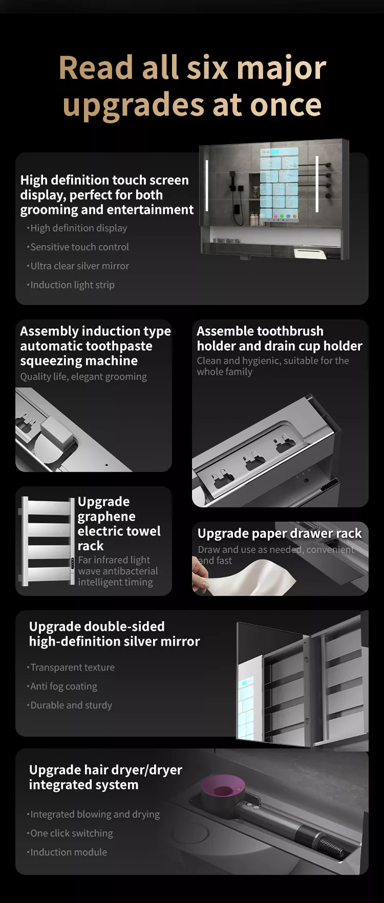 ชั้นวางผ้าเช็ดตัวในตัวใช้องค์ประกอบความร้อนของกราฟีนซึ่งไม่เพียง แต่สามารถทำให้ผ้าขนหนูแห้งได้อย่างรวดเร็วคลื่นแสงอินฟราเรดที่อยู่ไกลออกไปของกราฟีนซึ่งเป็นประโยชน์ต่อร่างกายมนุษย์สามารถฆ่าเชื้อและทำให้ผ้าเช็ดตัวได้ เครื่องยาสีฟันแบบอัตโนมัติมาตรฐานและอุปกรณ์ฆ่าเชื้ออัลตราไวโอเลตคัพแปรงสีฟันทำให้การซักง่ายขึ้นปลอดภัยและมั่นใจและปกป้องสุขภาพของครอบครัวทั้งหมดหากคุณยังกังวลเกี่ยวกับกลิ่นชื้นในห้องน้ำผลิตภัณฑ์นี้มีระบบการฟอกอากาศในตัวและโมดูลน้ำหอม
