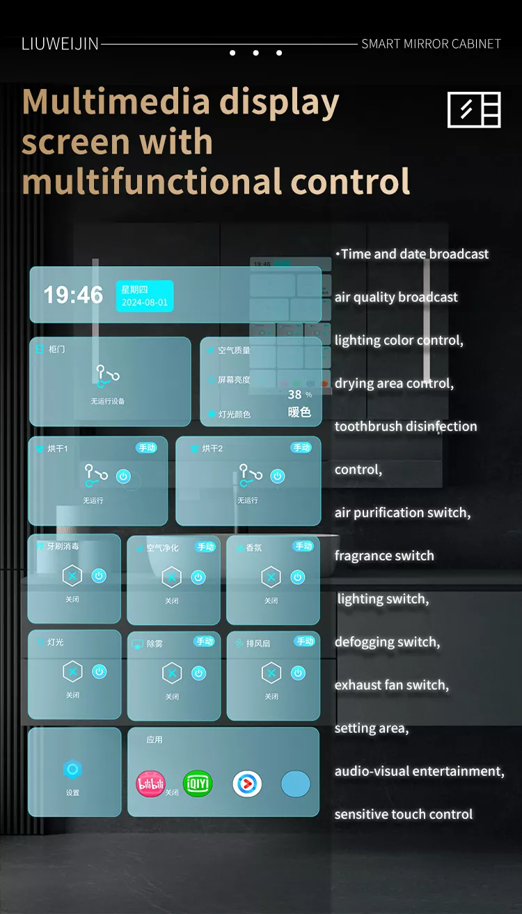 Liuwei Jinshi Graphene Smart Bath Mirror ตู้ทำจากวัสดุอัลลอยซึ่งมีความทนทานและกันความชุ่มชื้นตามมาตรฐาน LED LED, เครื่องยาสีฟันอัตโนมัติเครื่องบีบ, ท่อระบายน้ำของฟัน, อุปกรณ์ขับเคลื่อนด้วยการติดเชื้อ ฆ่าเชื้อด้วยมือ, ระบบ defogging กระจก, ศูนย์ควบคุมประเภทเฉิง รูปแบบความหรูหรามาพร้อมกับชั้นวางเครื่องทำความร้อนแบบกราฟีนและผ้าเช็ดตัวแห้งระบบน้ำหอมอัจฉริยะและระบบการฟอกอากาศนอกจากนี้หน้าจอขนาดใหญ่รองรับความบันเทิงด้านเสียงและวิดีโอการแสดงสภาพอากาศและเวลาการดาวน์โหลดแอพ ฯลฯ เพื่อเสริมสร้างชีวิตของคุณ